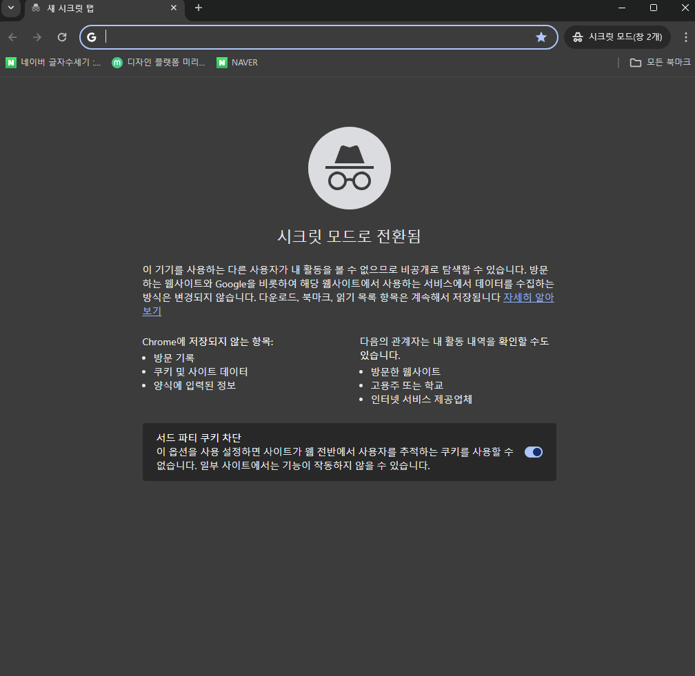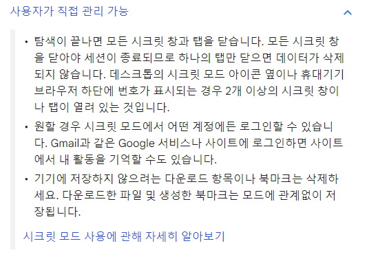 - 크롬 시크릿탭에서 저장되지 않는 항목 : 방문기록, 쿠키 및 사이트 데이터, 양식에 입력된 정보
