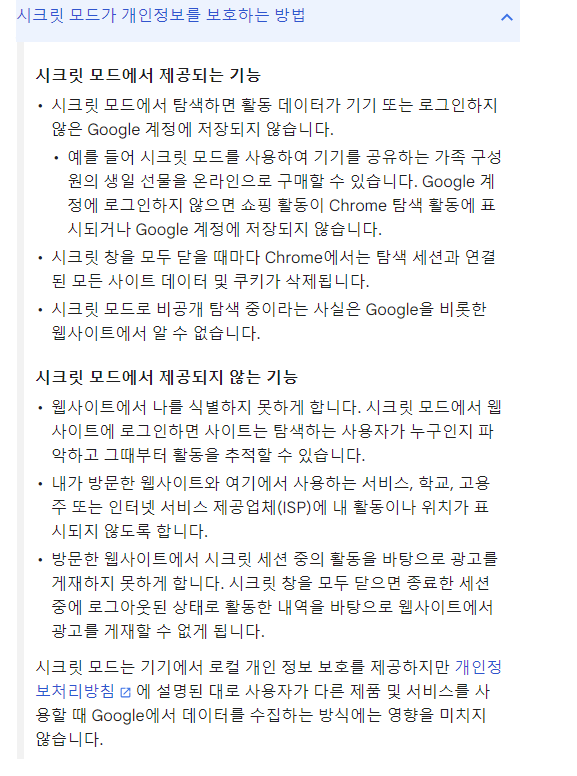 - 크롬 시크릿탭에서 저장되지 않는 항목 : 방문기록, 쿠키 및 사이트 데이터, 양식에 입력된 정보