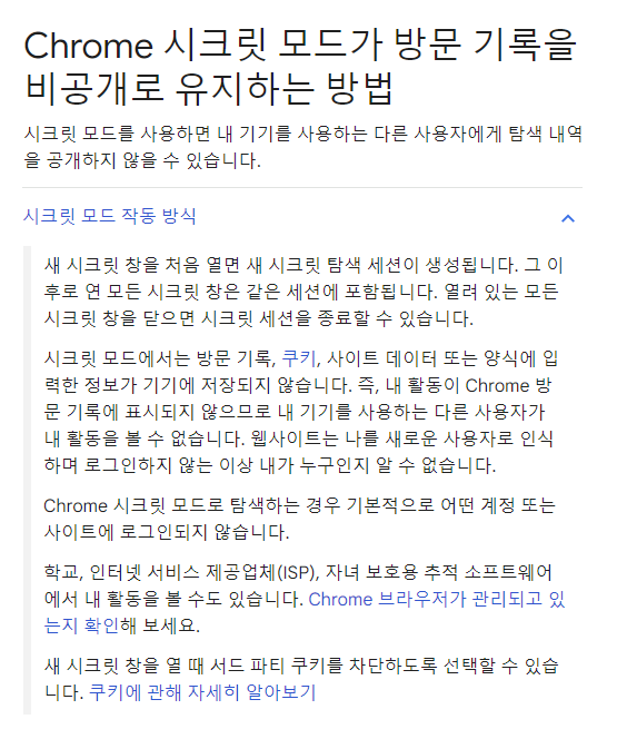 크롬 시크릿모드가 방문 기록을 비공개로 유지하는 방법과 시크릿모드에서 제공되는 기능, 제공되지 않는 기능에 대해서도 소개가 나와있습니다. 잘 읽어보시고 이용하시기 바랍니다.