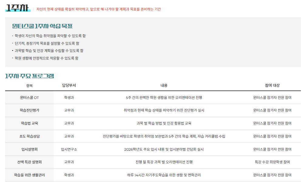 2025 수만휘 윈터스쿨 2~4주차 목표는, 본격적으로 자기주도학습 능력을 체화하면서 다양한 학습 훈련을 진행하는 것입니다. 학생의 학습 동기를 고취하면서, 오랜 시간 앉아 집중하는 학습체력을 기를 수 있도록 연습하는 기간입니다.