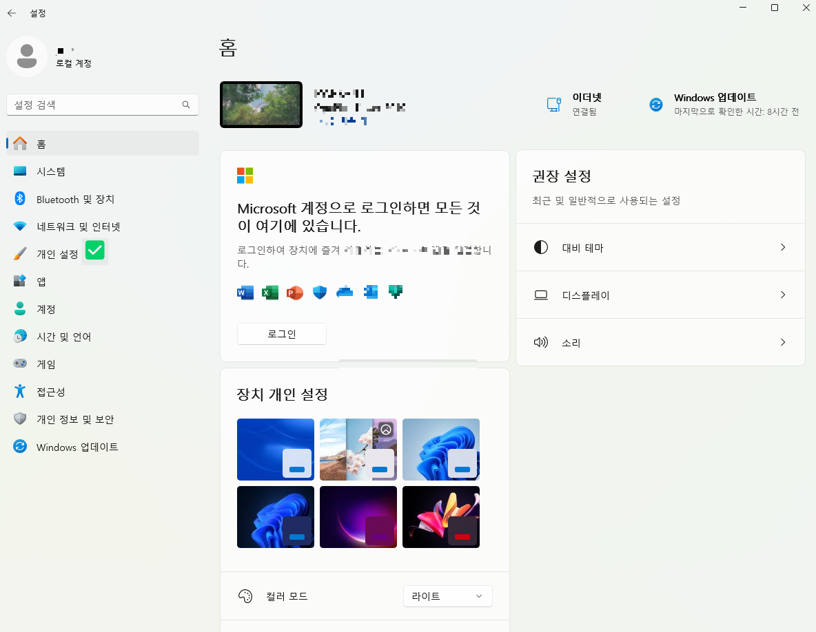 본인의 인터페이스에 맞게 여러 설정들을 맞춤형으로 변경할 수 있어요. 저는 다 똑같은 밋밋한 테마는 싫어서 PC를 사면 이렇게 제 마음대로 변경해주는 편입니다. 이런 게 새 것을 사는 재미 아니겠어요? :)
