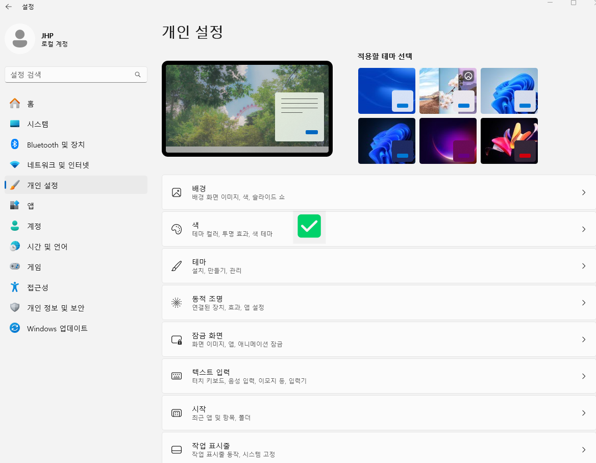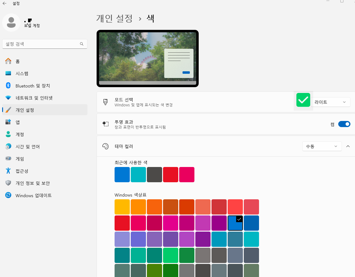개인설정에서 우측 탭 중에서는 '색'을 선택해 주세요. 테마 컬러나 투명효과, 색 테마 등을 변경할 수 있는 곳입니다.