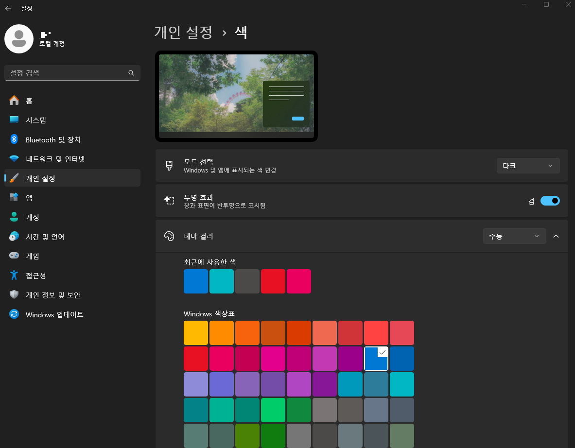 이외에도 이곳에서는 창과 표면을 반투명으로 표시하는 '투명효과'와 '테마 컬러'를 설정할 수 있습니다. 테마컬러는 윈도우 색상표를 통해서 결정할 수 있습니다. 컬러가 다양하니 내가 좋아하는 색상을 선택할 수 있겠죠.