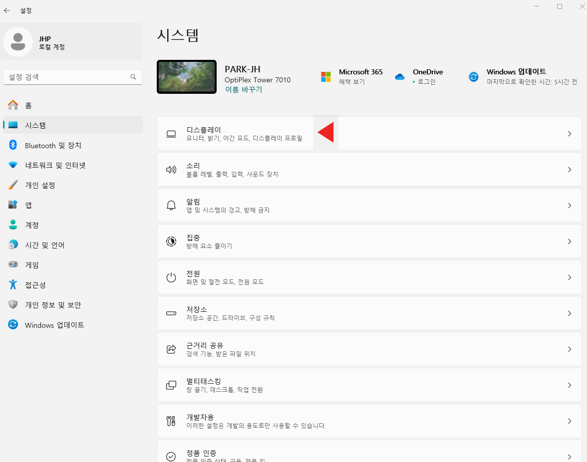 시스템 메뉴로 접속했다면, 가장 첫 메뉴인 '디스플레이'로 들어갑니다. 이곳에서는 모니터, 밝기, 야간모드, 디스플레이 프로필 등을 변경할 수 있습니다.