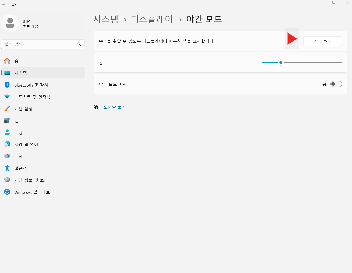 윈도우11 야간모드 블루라이트 차단 강도조절 시간예약 방법