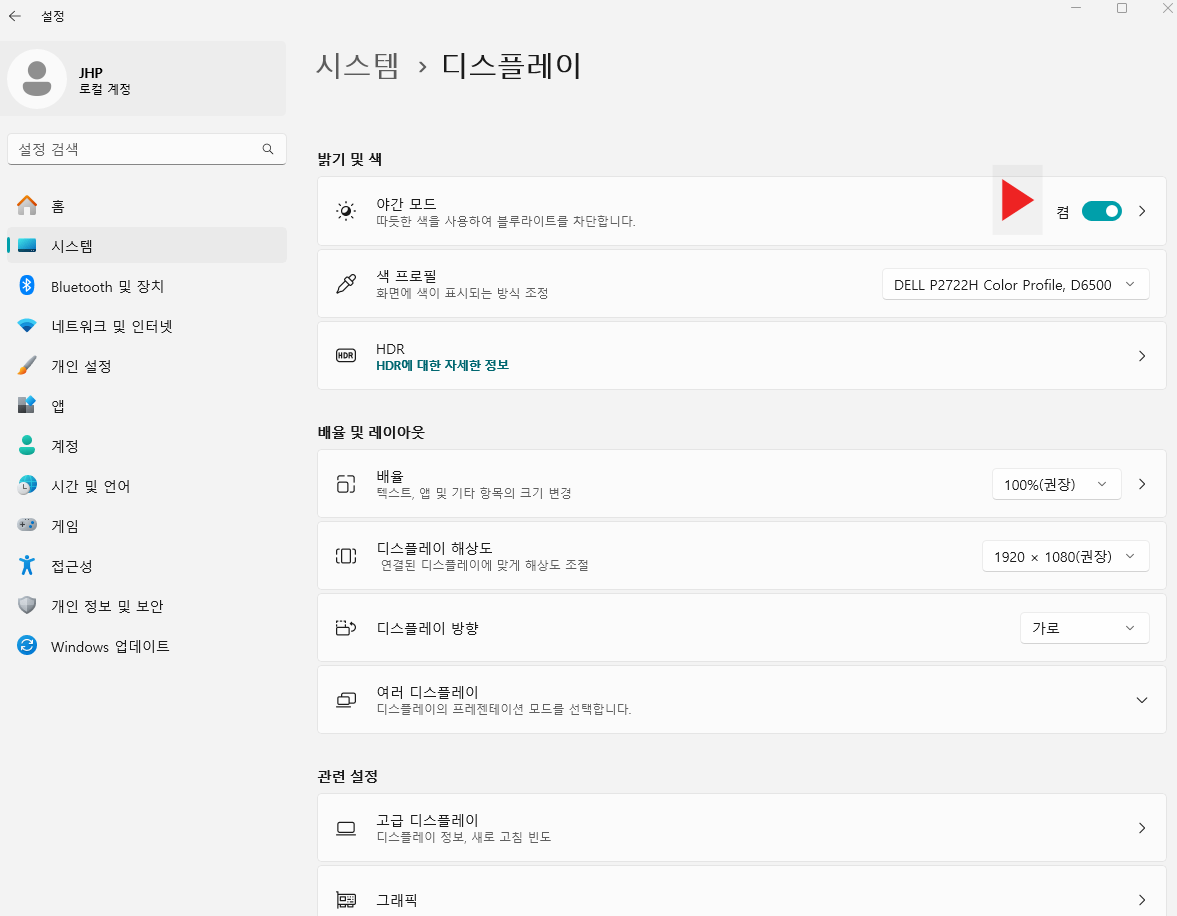 시스템 메뉴로 접속했다면, 가장 첫 메뉴인 '디스플레이'로 들어갑니다. 이곳에서는 모니터, 밝기, 야간모드, 디스플레이 프로필 등을 변경할 수 있습니다.