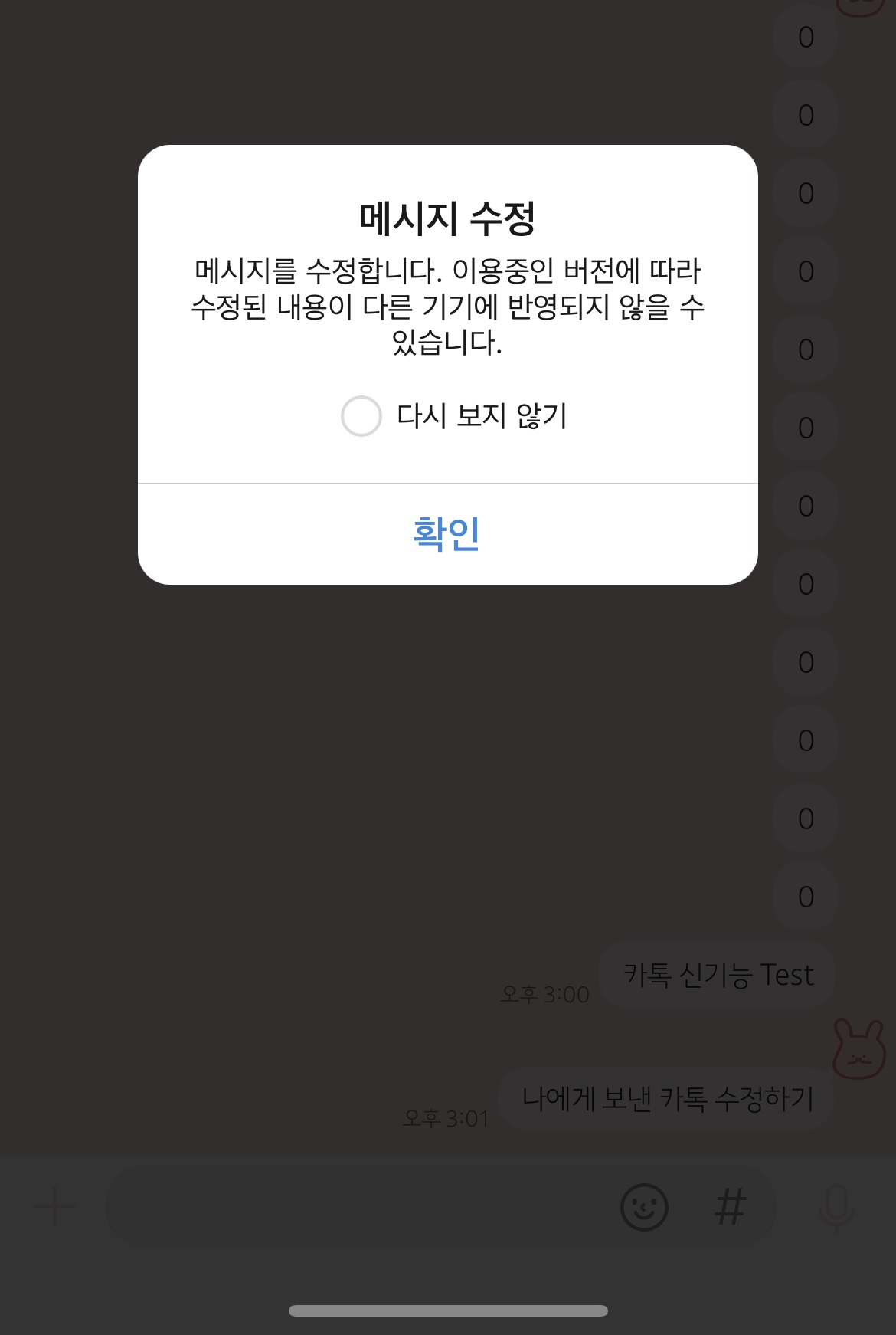 '메시지를 수정합니다. 이용중인 버전에 따라 수정된 내용이 다른 기기에 반영되지 않을 수 있습니다.'라는 문구가 뜨네요. 이 기능을 활용하기 위해서는 최신 버전으로 카톡 업데이트는 필수겠죠? 해당 메시지를 확인했다면 '다시 보지 않기'를 클릭하여 번거로움을 없애주세요.