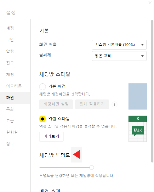 그러나 이는 개별 채팅방마다 적용하는 방법이기 때문에 개별 채팅방마다 투명도를 조절해줘야 합니다. 그렇기 때문에 전체 채팅방에 일괄 적용을 하고 싶다면 아래 방법을 이용해 주세요.