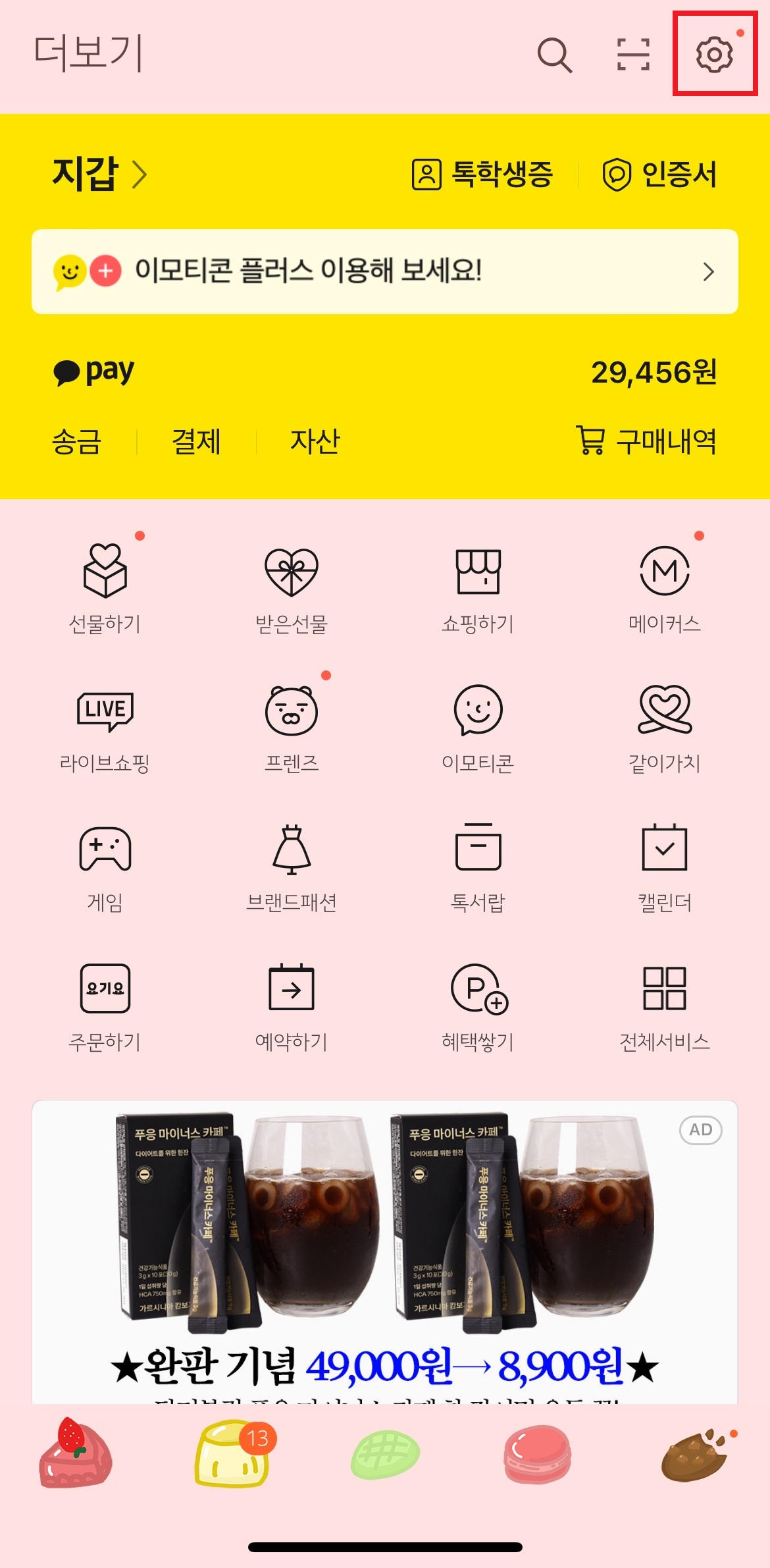 우선 카톡 더보기 우측 상단에 톱니바퀴 버튼을 클릭한 후, 중간 쯤 '채팅'을 클릭해줍니다. 그리하면 '미디어' 부분에 사진화질과 동영상 화질을 바로 설정할 수 있는데요.