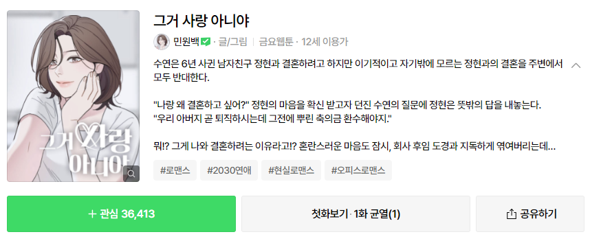 달달한 연애웹툰 그거 사랑 아니야는 글/ 그림 민원백 작가이며, 네이버 금요웹툰으로 12세 이용가입니다.