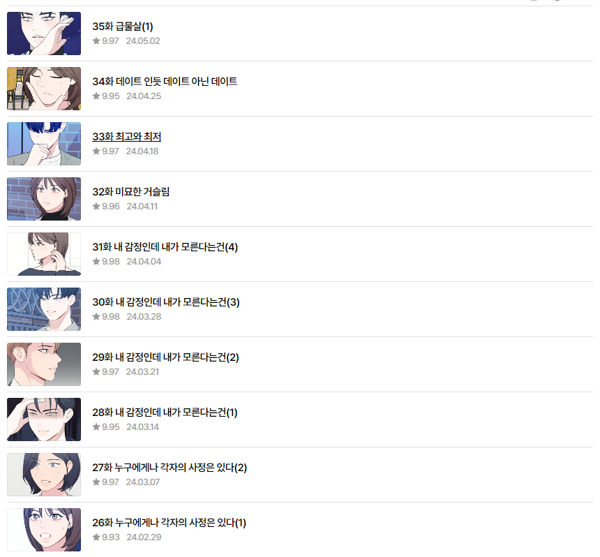 그러면서 여주인공과 자연스러운 이끌림에 설렘을 찾고 이별을 극복하며 둘이 이어지는 스토리가 될 것 같아요. 어떻게 보면 클리셰가 가득한 내용이지만 저는 참 재밌게 보고 있는 네이버 웹툰 추천 로맨스랍니다. 빨리 둘이 잘 되어 달달한 연애 웹툰이 되면 좋겠네요.