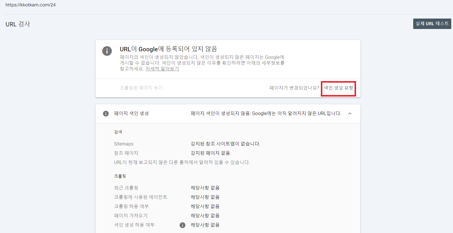 URL이 Google에 등록되어 있지 않다는 문구가 보이실텐데요. 색인이 생성되지 않은 페이지는 구글에 게시할 수 없기 때문에 반드시 색인 생성 요청을 통해 티스토리 블로그 노출수를 늘려야 합니다.