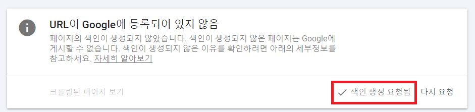URL이 우선순위 크롤링 대기열에 추가되었습니다. 페이지를 여러 번 제출해도 대기열 위치나 우선순위가 변경되지 않으므로, 여러 번 색인 생성 요청을 클릭할 필요가 없다는.