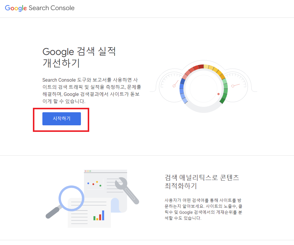 먼저 구글 서치콘솔 홈페이지로 접속합니다. 그리고 메인화면에서 '시작하기' 버튼을 클릭해주세요.