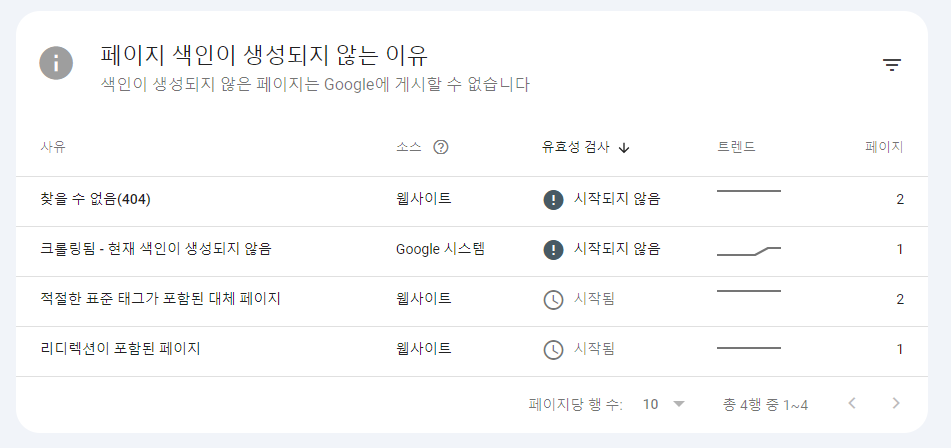 그리고 아래 쪽에는 티스토리 구글 서치콘솔 등록 방법대로 했으나 색인이 생성되지 않은 이유를 알 수 있습니다. 보통은 URL 오류인 경우가 많은데요. 사유를 클릭하여 자세한 내용을 확인해보고 재 요청을 할 수 있으니 참고하시기 바랍니다.