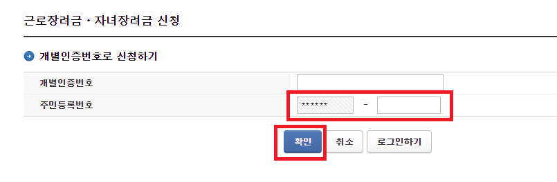 1. 국세청 > 근로/자녀장려금 신청 > 주민등록번호 조회