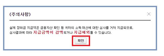신청완료 팝업이 뜨면 완료된 것입니다. 팝업을 닫으면 지급액을 확인할 수 있습니다.