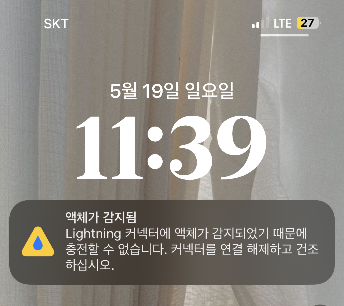 다른 콘센트나 충전기를 사용했는데도 계속 아이폰 Lightening 커넥터 액체 감지 문구가 뜬다면 충전을 즉시 멈춰주시고 아이폰 서비스센터를 방문하세요!