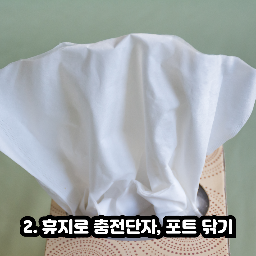 드라이기로 했는데도 해결이 안 되더라구요. 그래서 아이폰 충전 단자를 휴지로 닦고, 휴대폰 충전기 또한 휴지로 닦아 혹시 모를 물기를 건조시켜주었습니다.
