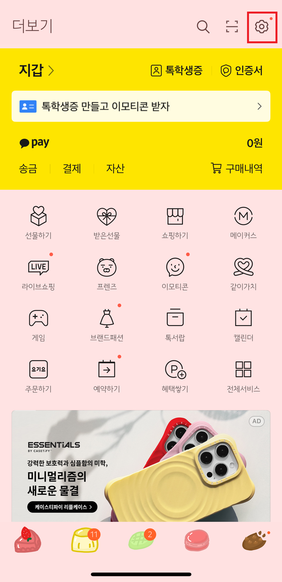 우선 카카오톡 어플에서 하단 탭 중 가장 오른쪽 버튼을 클릭해주세요. 그리고 우측 상단의 톱니바퀴 버튼을 눌러주세요. 이 경로가 '설정'이기 때문에 무언가 카톡 설정을 바꾸고 싶다면 일단 이곳와서 찾아보시면 됩니다.