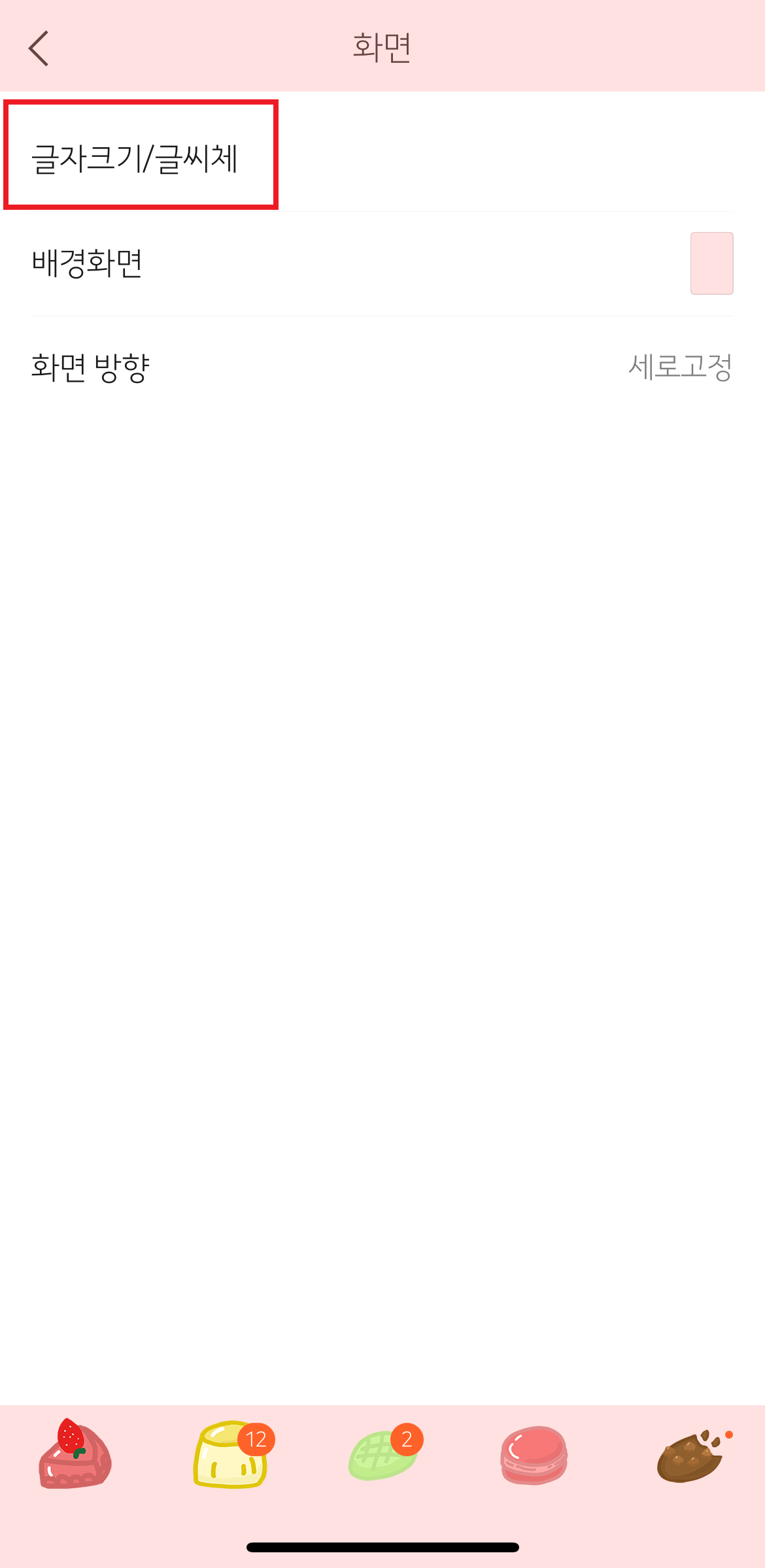 설정에서 '화면'으로 들어와주시면 '글자크기/글씨체' 탭이 보입니다. 이대로 들어와주세요.