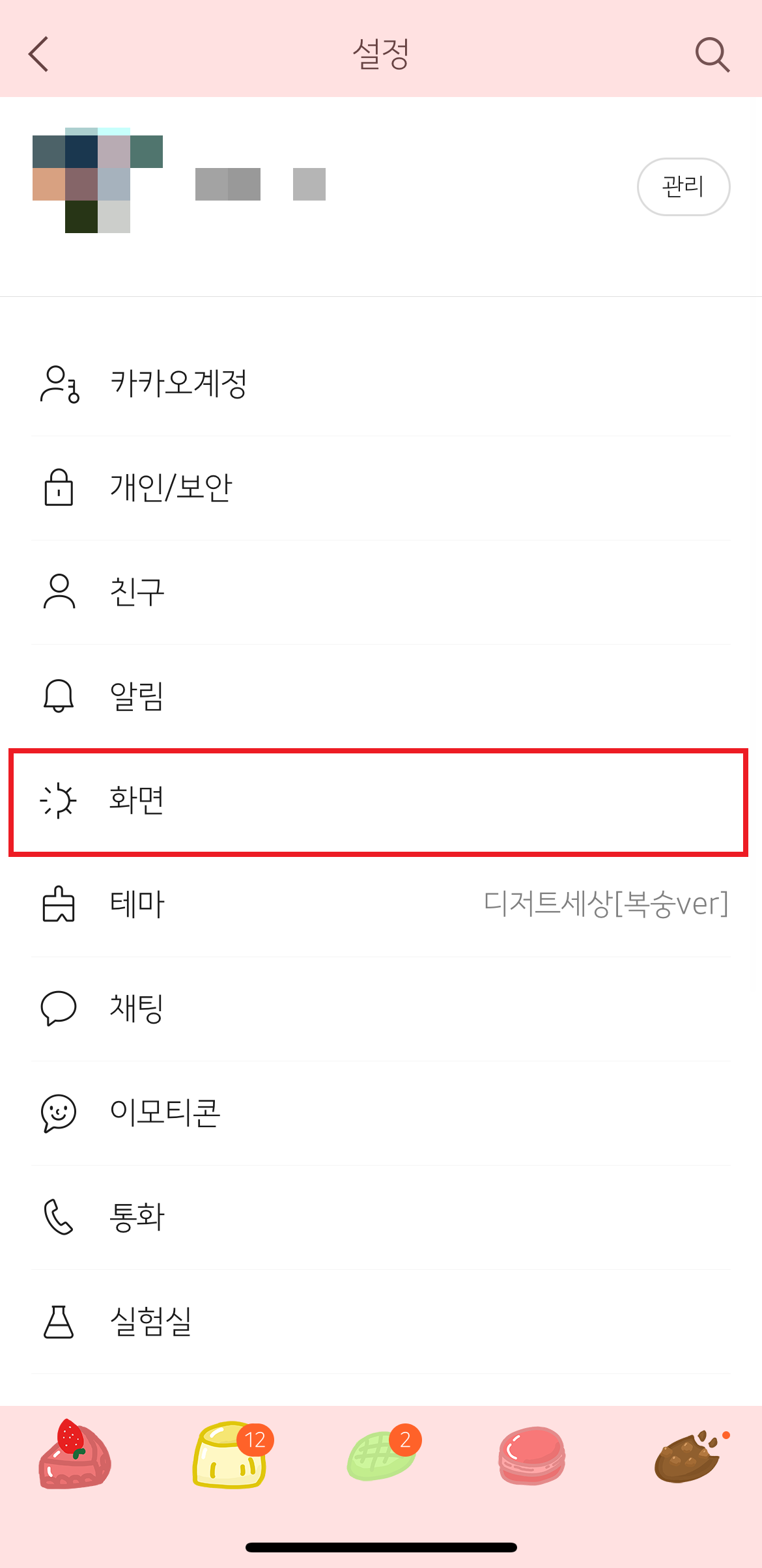 1. 카카오톡 가장 우측 하단 버튼 > 우측 상단 톱니바퀴 > 화면 > 글자크기/글씨체