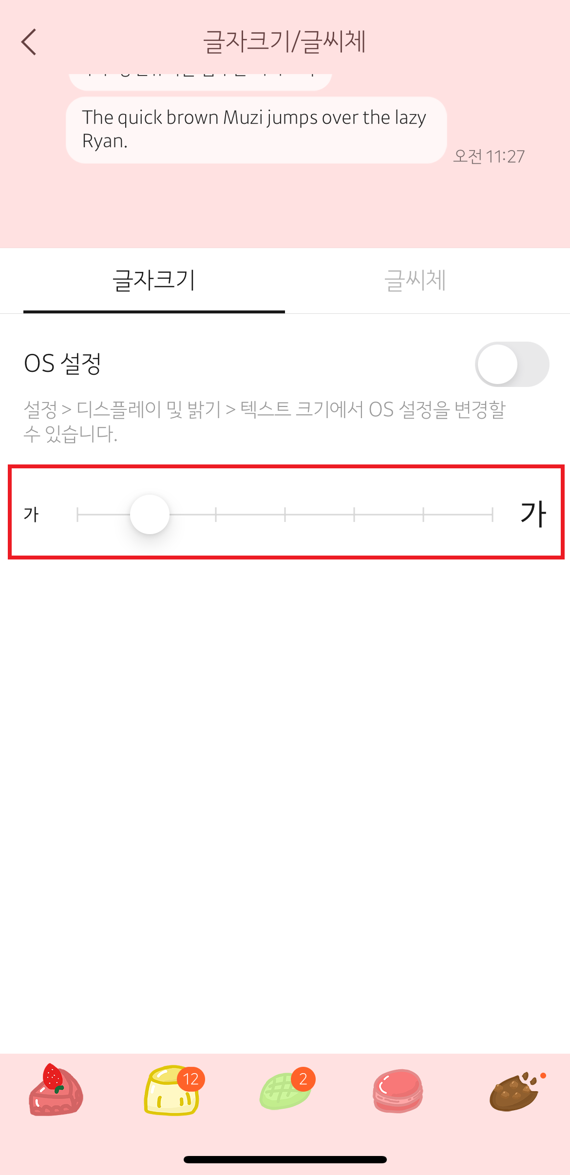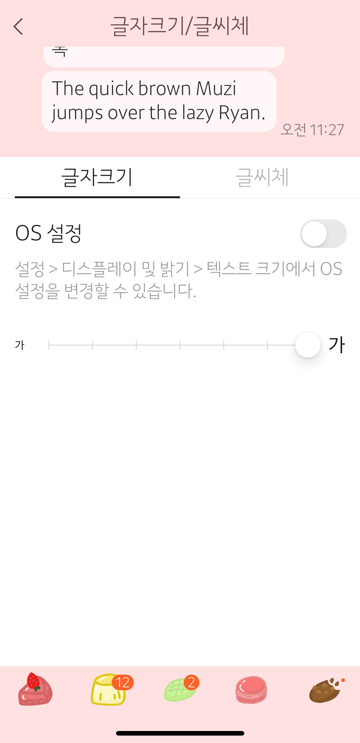 OS 설정 버튼을 ON 시키면, 설정 > 디스플레이 및 밝기 > 텍스트 크기에서 OS 설정을 변경할 수 있습니다.