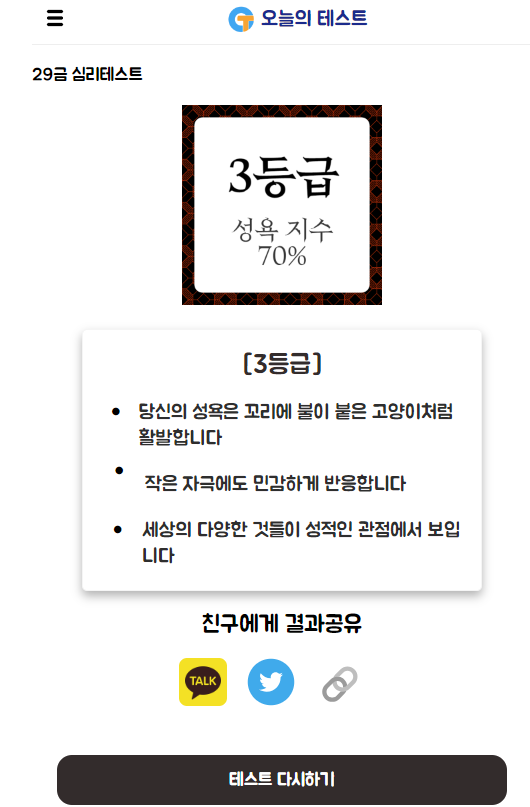 간단한 응답 후 제 성욕테스트 결과가 나왔습니다. 무려 3등급에 성욕 지수는 70%가 나왔네요. 뭐 정확하다고 말씀드리기는 애매합니다만, 3등급의 내용을 읽어보자면 꼬리에 불이 붙은 고양이처럼 활발하며, 작은 자극에도 민감하게 반응합니다. 세상의 다양한 것들이 성적인 관점에서 보입니다. 라는 설명이 붙어있네요.