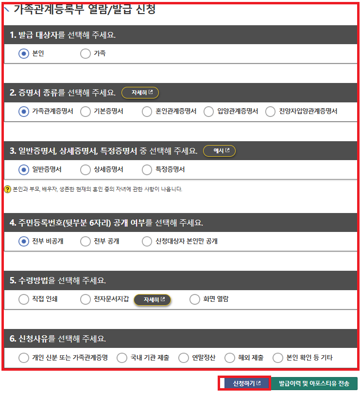 이후 발급대상자, 증명서 종류, 일반/상세/특정 선택, 주민등록번호 뒷자리 공개여부, 수령방법, 신청사유를 선택한 후 '신청하기'를 클릭해줍니다.