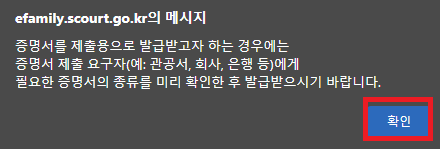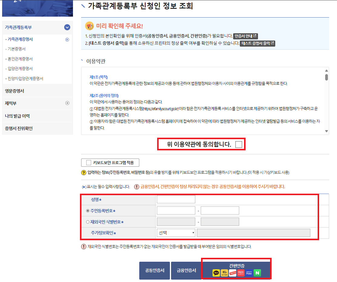 대법원 홈페이지 > 가족관계증명서 > 간편인증 로그인 > 신청하기 > 출력