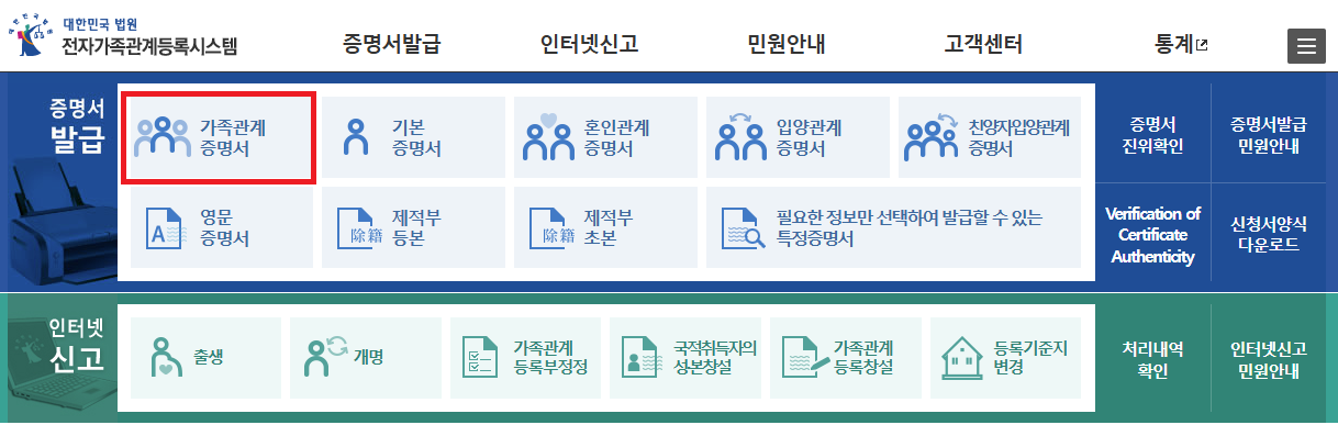 가족관계증명서 인터넷발급 바로가기