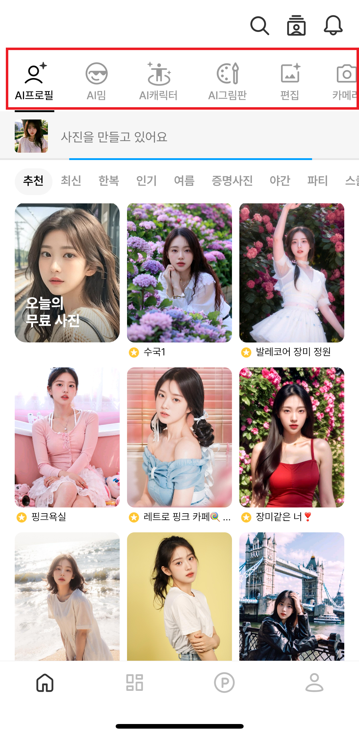 캐럿 어플은 AI 프로필뿐만 아니라, AI 밈, 캐릭터, 그림판, 편집, 카메라 필터 기능을 제공합니다. 가장 하단 우측 프로필 버튼을 통해 내 프로필도 따로 운영할 수 있어요.