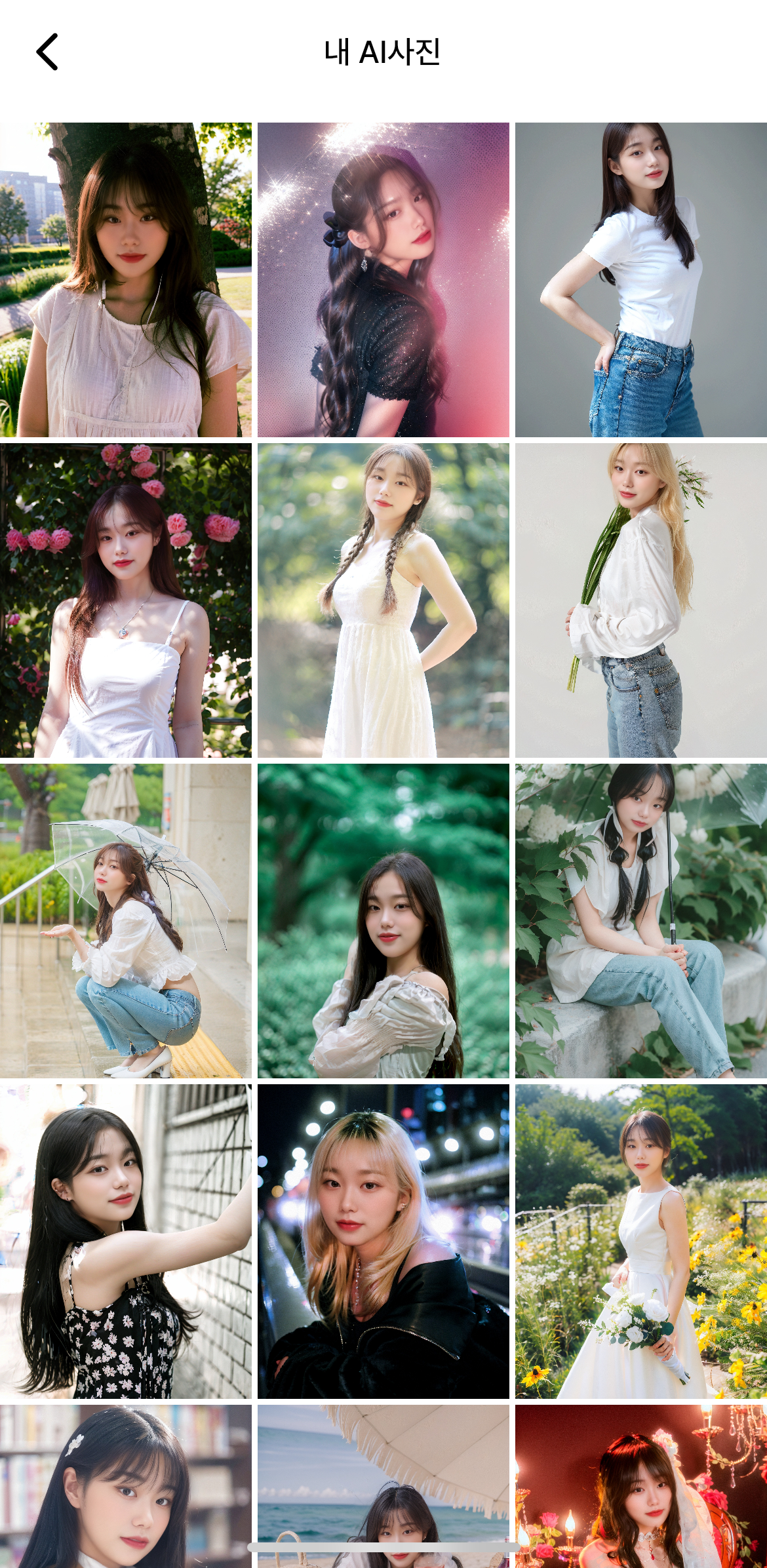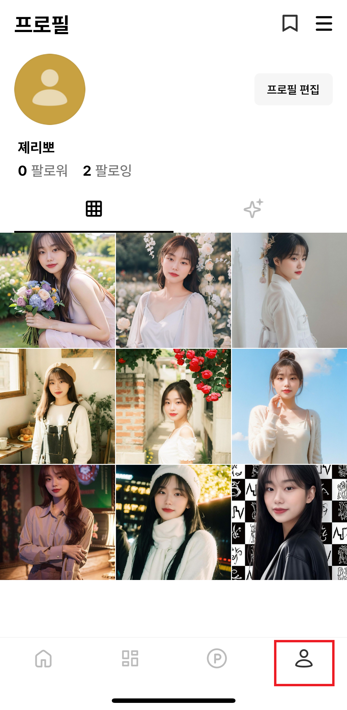 내 AI 사진 모음도 볼 수 있어요. 사진 저장 혹은 공유하기도 가능하고, 캐럿 어플 내 프로필에 업로드도 가능하답니다. 직접 저런 컨셉으로 꾸며볼 시간과 돈이 없는데 AI가 대리만족을 시켜주니 좋더라구요 :)