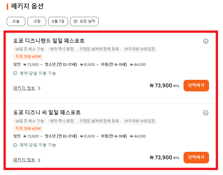 '도쿄 디즈니 리조트 티켓'에서 디즈니랜드, 디즈니씨 입장권을 모두 구매할 수 있습니다.