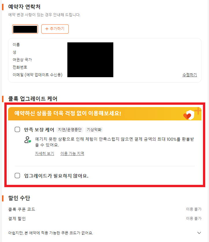 예약자 정보를 등록한 후, 클룩 업그레이드 케어를 선택해주세요. '만족 보장 케어'란 약 9천원 정도가 추가되는 대신 예기치 못한 상황에 체험이 불가할 경우 100% 환불받을 수 있는 제도입니다. 그러나 저는 날씨를 미리 확인하였기에 100% 갈 것으로 확신하고 업그레이드를 하지 않았습니다.