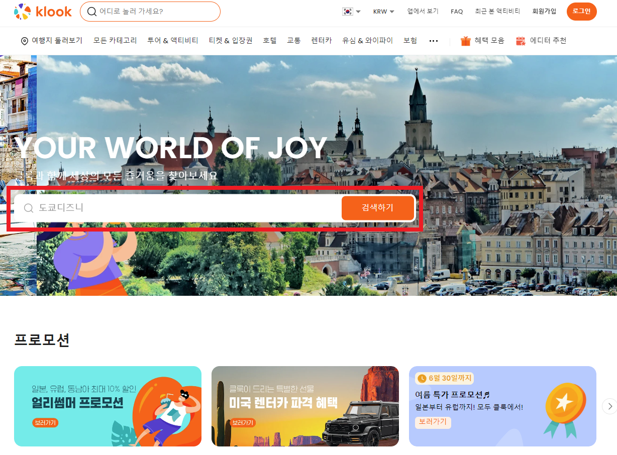 우선 클룩 홈페이지로 들어가서 '도쿄 디즈니'라고 검색해주세요.