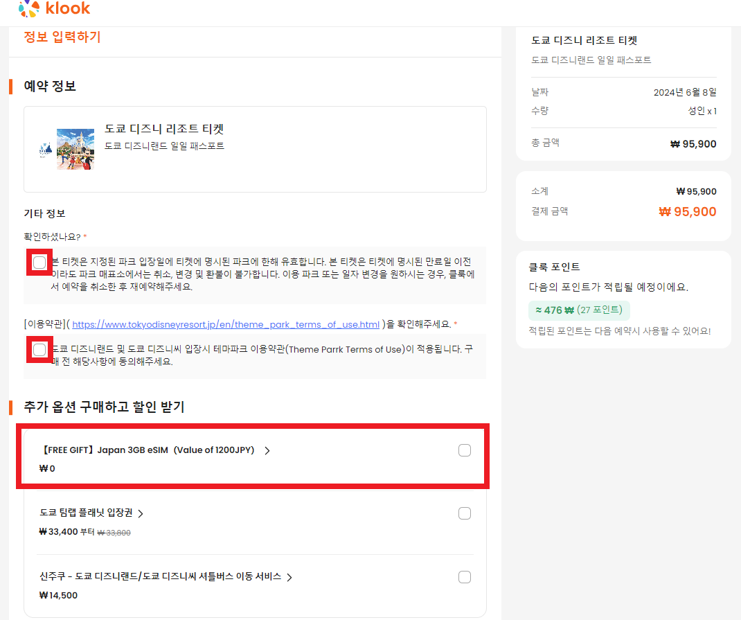 인터넷에 클룩 6월 할인쿠폰을 검색해서 웬만한 건 다 찾아보았지만, 도쿄 디즈니랜드 예약방법에는 적용되지 않더라구요?.. 요망한 클룩... ㅠ 결국 정가에 구매했습니다.
