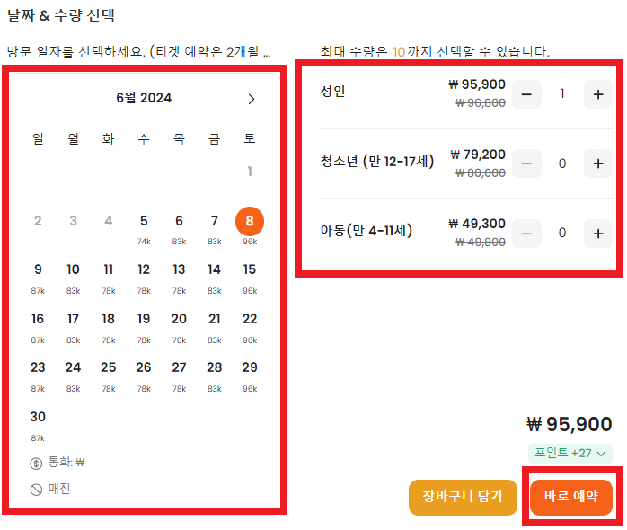 날짜 선택 시 요금이 함께 안내되어 있는데요. 날짜별로 요금이 상이하니 잘 확인하시기 바랍니다. 주말이나 공휴일에는 1~2만원 정도 더 비싼 금액이에요.