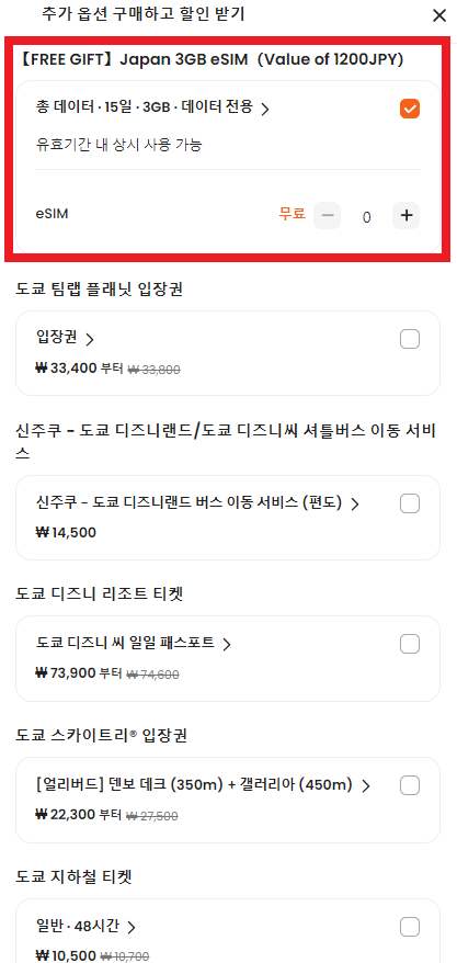 나머지 셔틀버스나 도쿄 디즈니씨 입장권, 스카이트리, 지하철 티켓 등 다양한 상품을 끼워팔고 있습니다. 필요하신 분들은 구매하시면 되겠습니다.
