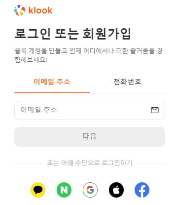 클룩은 이메일주소나 전화번호, SNS 계정으로 간단하게 회원가입이 가능해요. 번거로운 건 딱 질색인데 휴대폰 인증번호만으로도 가입이 돼서 잘됐지 뭐예요.