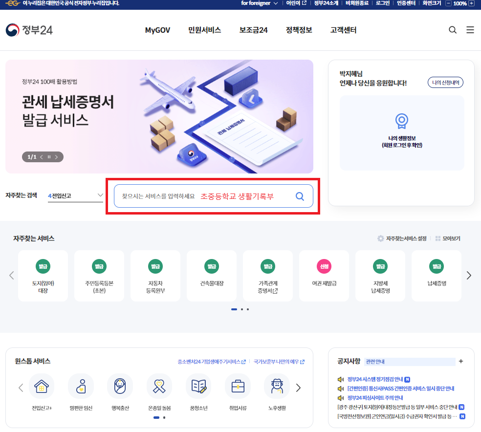 위에서 안내드린 것처럼 정부24 홈페이지에 들어간 후, '초중등학교 생활기록부' 서비스를 검색해주세요.
