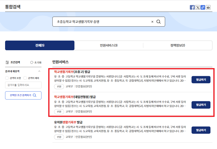 정부24 > '초중등학교 생활기록부' 검색 > 발급하기