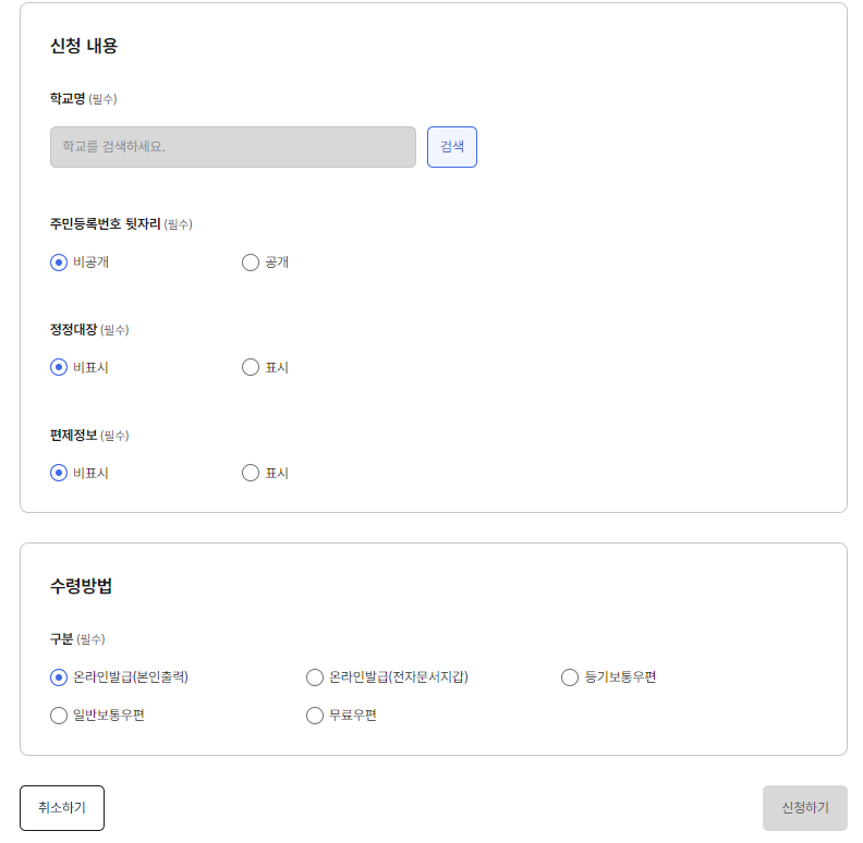 학교명 선택, 주민등록번호 뒷자리 공개여부, 정정대장, 편제정보 등을 선택한 후, 수령방법을 고릅니다. 전자문서지갑이나 우편 등도 있지만, 아무래도 가장 편리한 방식은 온라인발급(본인출력)이겠죠?