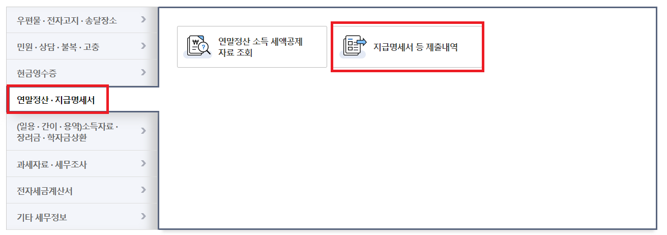 좌측 탭 중 연말정산·지급명세서로 접속한 후, '지급명세서 등 제출내역'을 클릭해주세요.