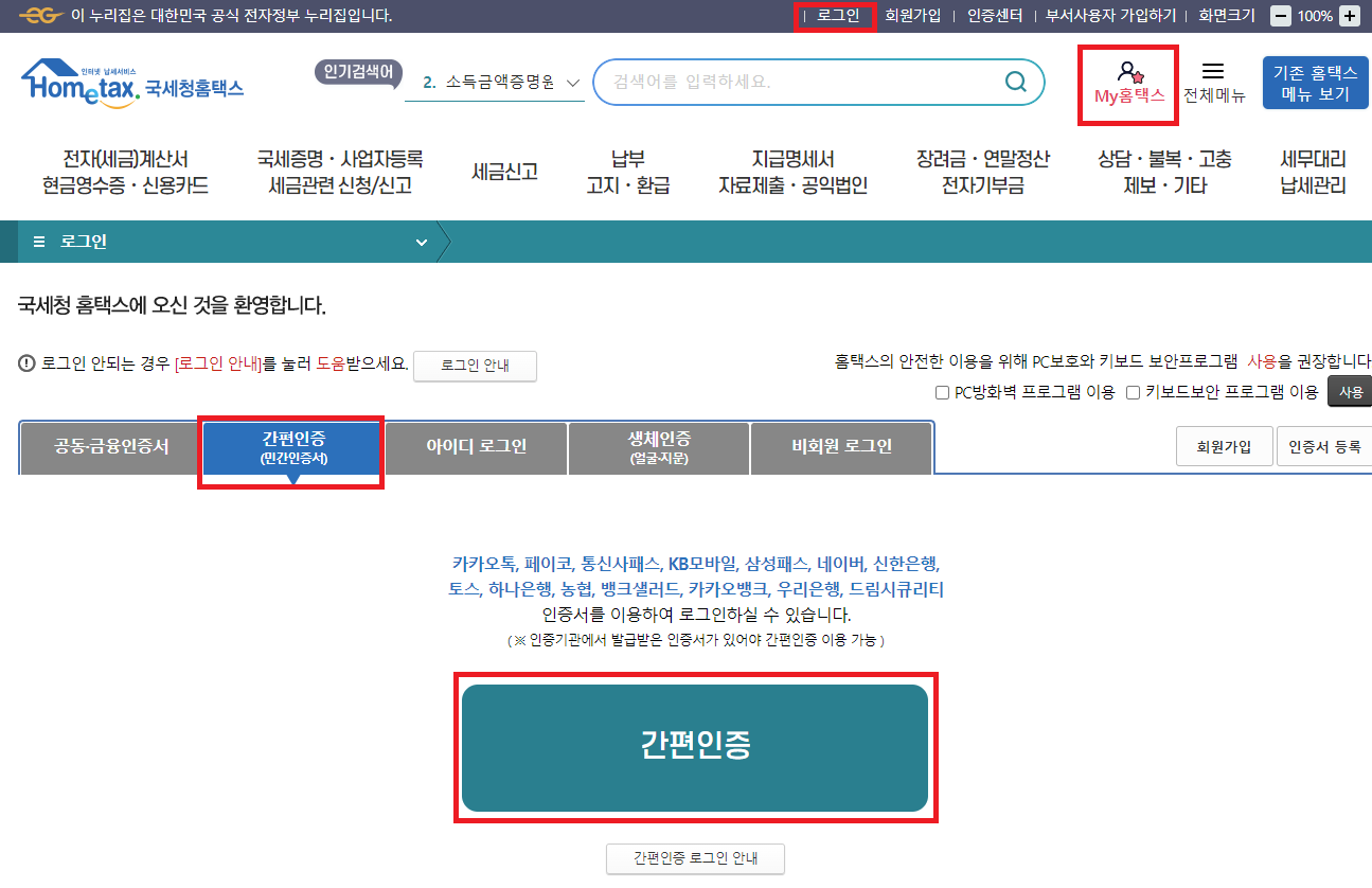 홈택스 홈페이지에서 로그인을 진행해주세요. 개인적으로 간편인증 로그인이 편리하더라구요. 카카오톡은 누구나 사용하는 어플리케이션이니 카톡 로그인 인증이 제일 간편하답니다.