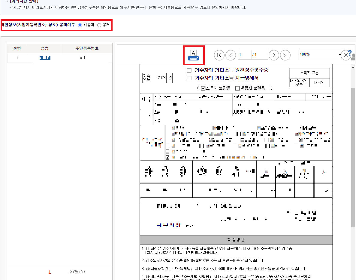 인쇄하기로 들어오면, 사업자등록번호, 상호 등 개인정보 공개여부를 선택할 수 있습니다. 그 후, 'A'라고 생긴 인쇄 버튼을 눌러주시면 PDF 인쇄가 가능합니다.