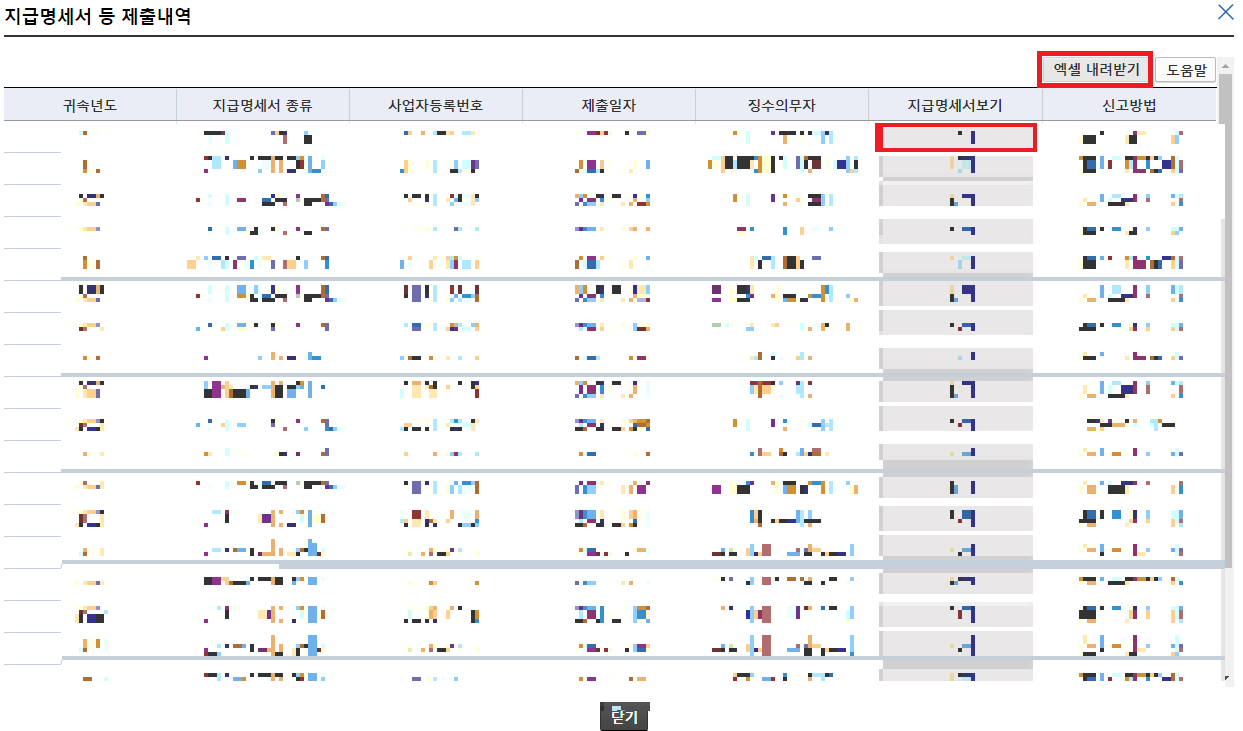 홈택스에 제출된 내역들만 확인이 가능하며, 귀속년도, 지급명세서 종류, 사업자등록번호, 제출일자, 징수의무자, 신고방법 등을 확인할 수 있습니다.