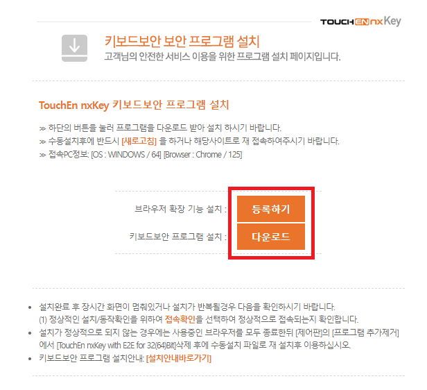 키보드보안 프로그램 설치를 누르면 브라우저 확장 기능 설치 등록, 키보드보안 프로그램 설치 다운로드가 뜨는데, 각각 눌러주시면 됩니다. 크롬 시크릿모드의 경우 브라우저 확장 기능 설치가 불가하니, 일반 크롬 혹은 마이크로소프트 엣지 등의 타 브라우저를 사용해주세요.
