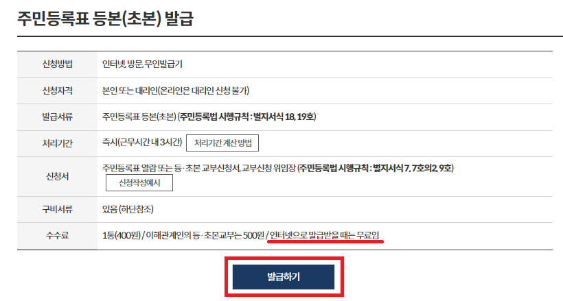 다행히 주민등록등본 인터넷발급 방법으로는 수수료가 없습니다. 동사무소에서 발급받을 때에는 1통에 400원의 수수료가 발생하니 돈도 안 들고 더 편한 방법이지요.