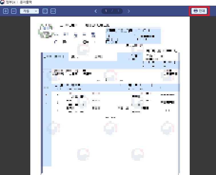 그렇게 완료된 문서는 '출력' 버튼을 눌러주면 인쇄가 가능합니다. 동사무소에 방문할 필요도 없고, 수수료도 들지 않고, 즉시 업무가 처리되기 때문에 정말 편한 방법이에요.